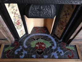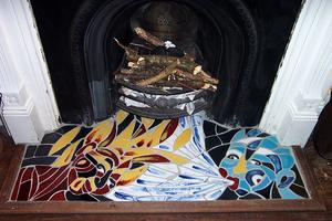 Handmade tile mosaic, for fireplace hearth. Craft crank clay, coloured glazes