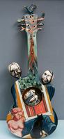 Hand built white clay sculpture, slips oxides, guitar which sings with colours